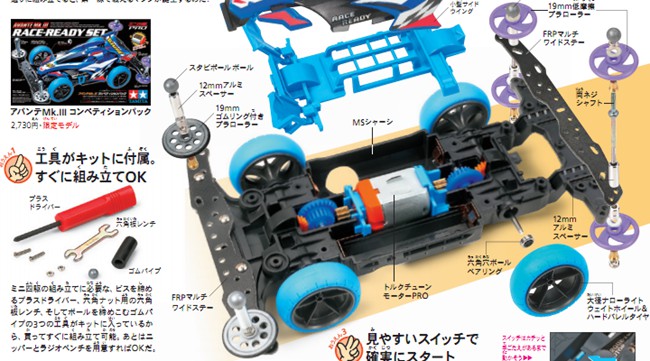 AR:田宫仍然没有放弃轴车的证明,在田宫车上使用下装电池的结构也是首次。AR底盘的强度很大,并且拥有优秀的速度,无论技术道还是竞速道都可以玩的得心应手。缺点是传动结构容易出现问题,但通过改造可以克服。